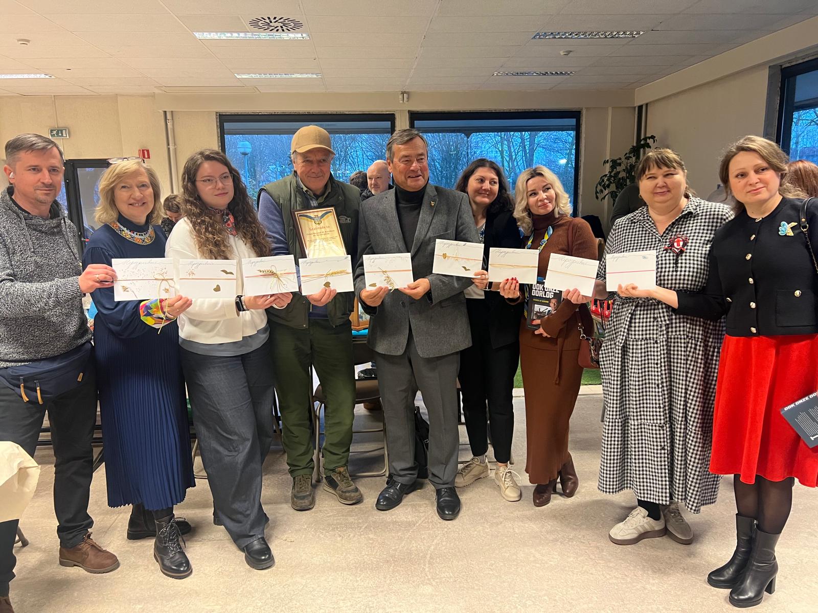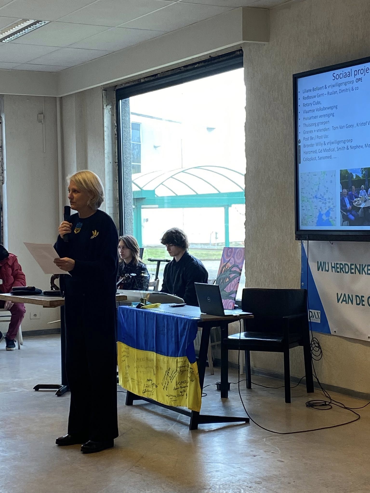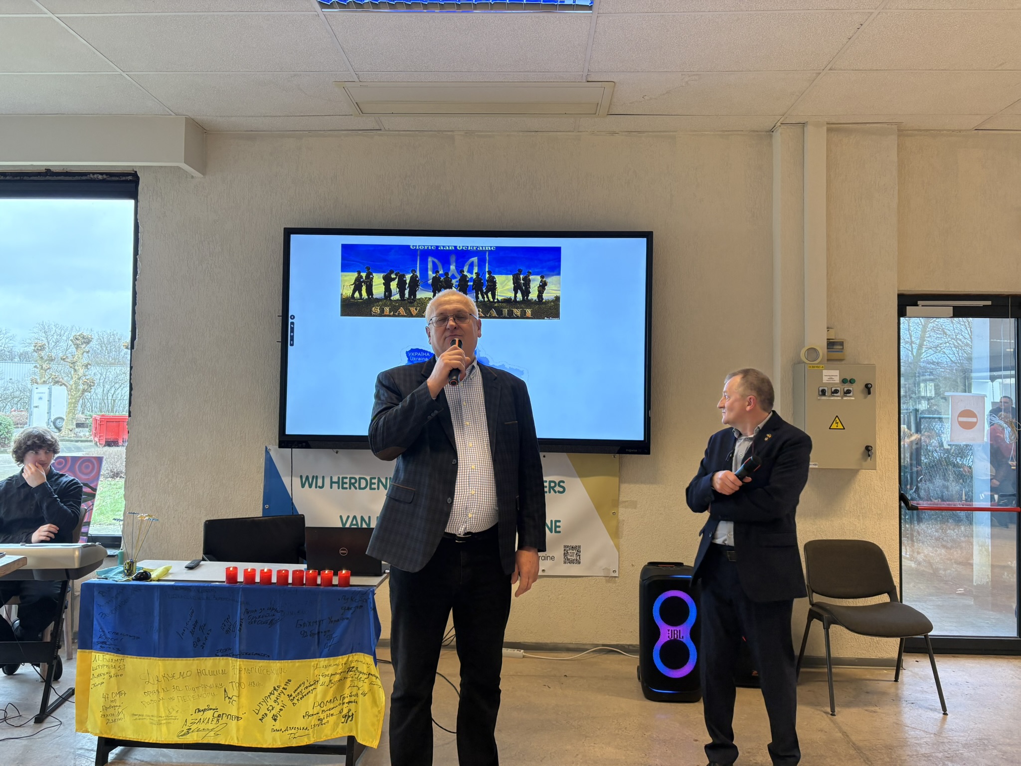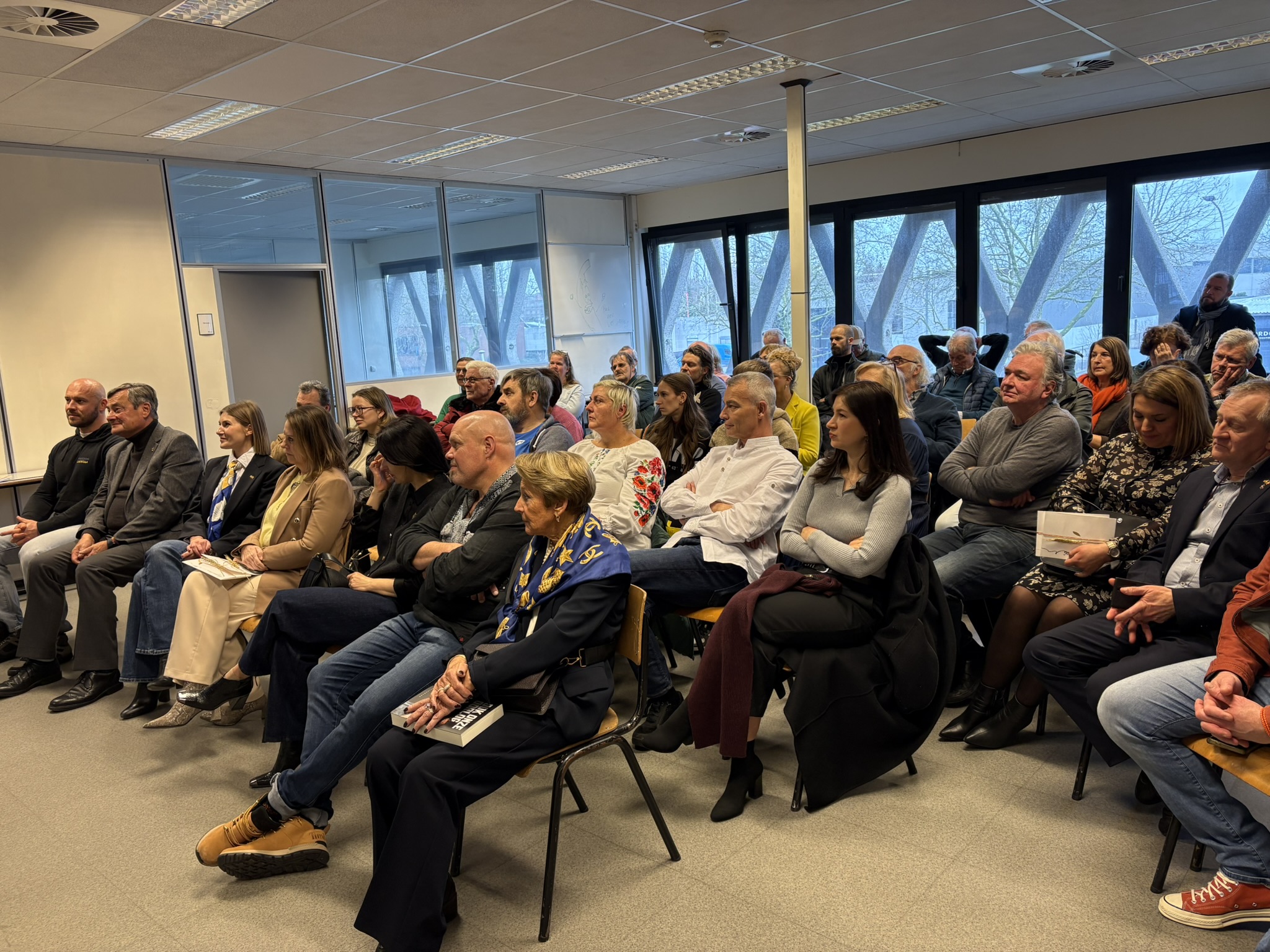 Bij de opening van de Herdenkingsdag 'Ook onze oorlog' mochten de organisatoren een ruim publiek verwelkomen. Oekraïners, Vlamingen, Tsjetsjenen, Georgiërs, Wit-Russen en Nederlanders stonden zij aan zij voor de openingsspeech van Annemarie Gielen, gevolgd door een kaarsritueel en een minuut stilte. Daarna volgden getuigenissen van dr. Ihor Vitenko, van de viceburgemeester van Zbarazj - Volodymyr Bohaychyuk -, van Dmitry Vasiliev, afgevaardigde van de Oekraïense ambassade in België, van Alim-Pasha Sholtychanov (regering in ballingschap van de Tsjetsjeense Republiek Itsjkerië) en van Svitlana Musina, van de vereniging Kryla uit Brugge. Verhalen van oorlogsleed, menselijke tragedies, vernieling van steden en natuur, en nu ook nog van de hevige kou door de bombardementen van Rusland op energievoorzieningen raakten het publiek diep. Gelukkig brachten violiste Lana en pianist Dmytro balsem voor de ziel.