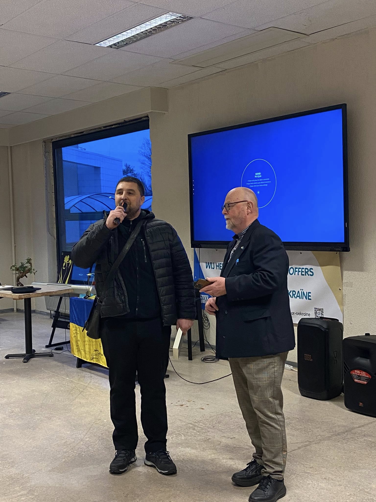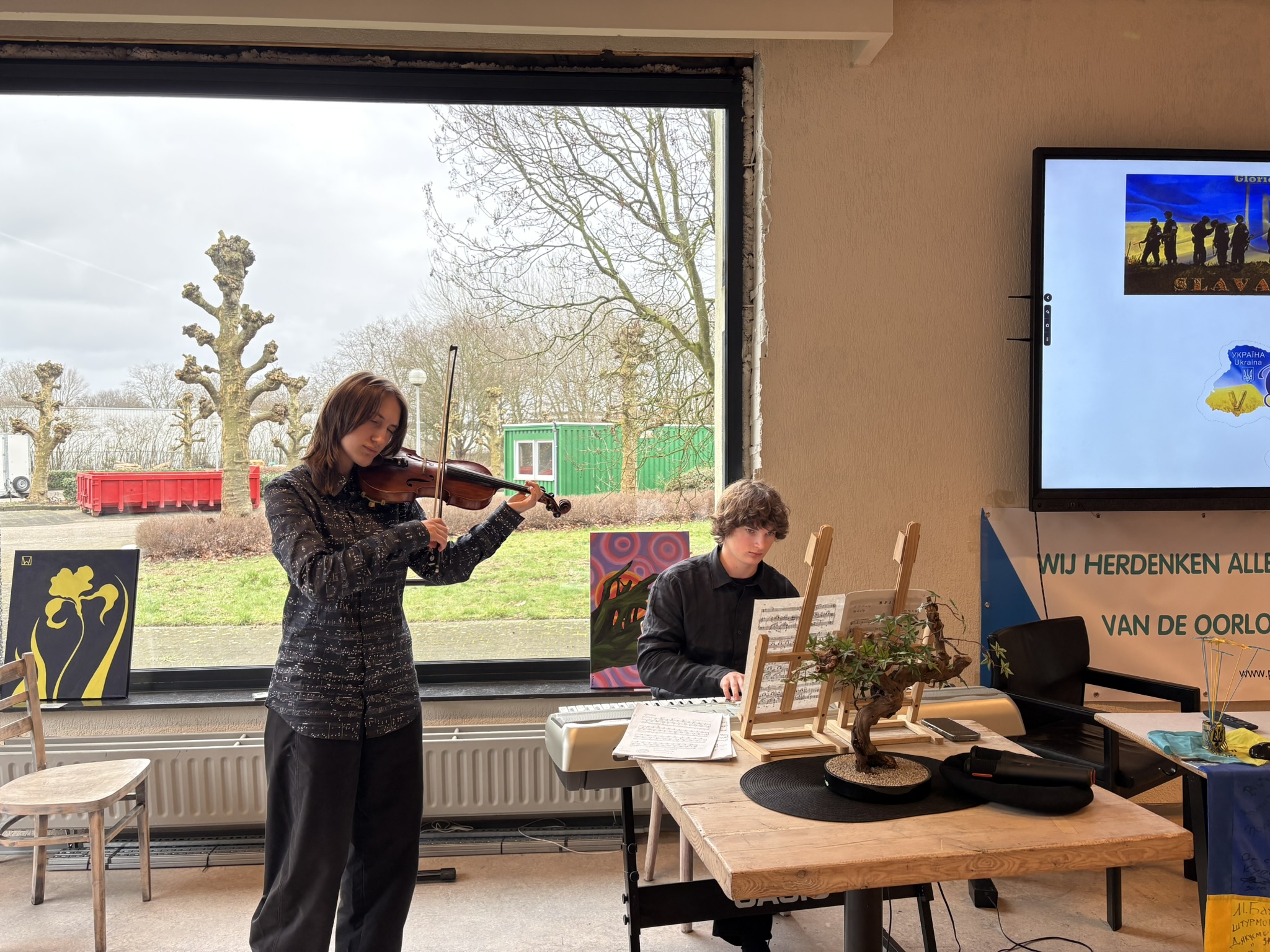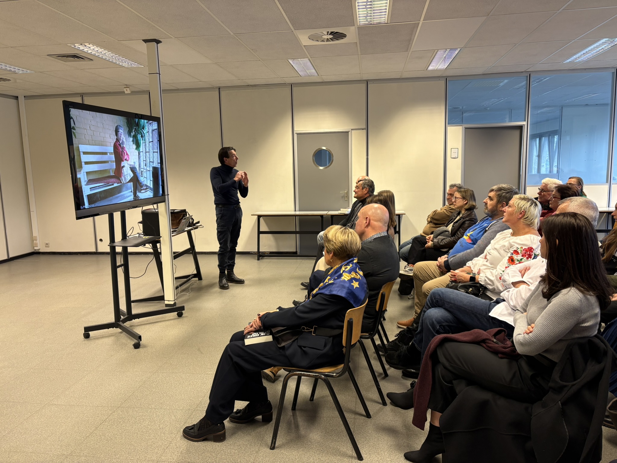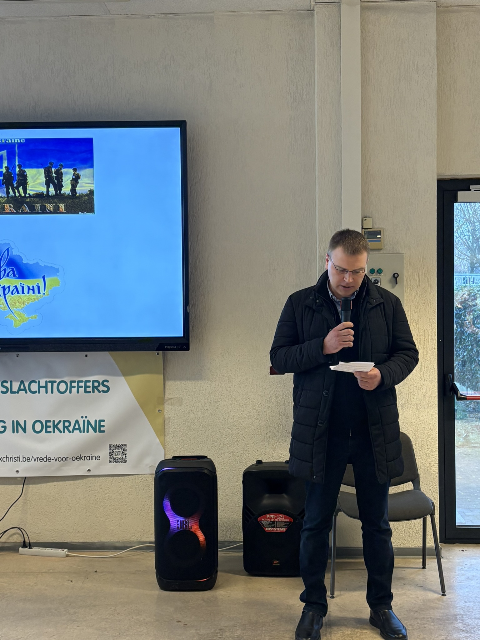 Bij de opening van de Herdenkingsdag 'Ook onze oorlog' mochten de organisatoren een ruim publiek verwelkomen. Oekraïners, Vlamingen, Tsjetsjenen, Georgiërs, Wit-Russen en Nederlanders stonden zij aan zij voor de openingsspeech van Annemarie Gielen, gevolgd door een kaarsritueel en een minuut stilte. Daarna volgden getuigenissen van dr. Ihor Vitenko, van de viceburgemeester van Zbarazj - Volodymyr Bohaychyuk -, van Dmitry Vasiliev, afgevaardigde van de Oekraïense ambassade in België, van Alim-Pasha Sholtychanov (regering in ballingschap van de Tsjetsjeense Republiek Itsjkerië) en van Svitlana Musina, van de vereniging Kryla uit Brugge. Verhalen van oorlogsleed, menselijke tragedies, vernieling van steden en natuur, en nu ook nog van de hevige kou door de bombardementen van Rusland op energievoorzieningen raakten het publiek diep. Gelukkig brachten violiste Lana en pianist Dmytro balsem voor de ziel.